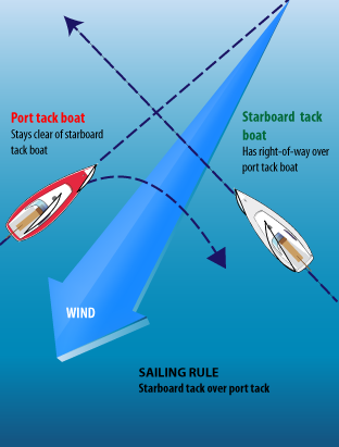 - Når to sejlbåde har vinden ind fra forskellige sider, skal den båd, der har vinden ind fra styrbord (styrbord halse) vige for båden, der har vinden ind fra bagbord (bagbord halse).